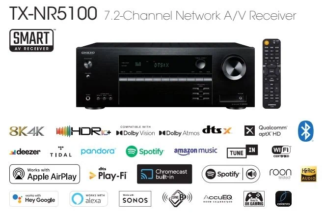 רסיבר Onkyo TX-NR5100, רסיבר 5.2 ערוצים, רסיבר Dolby Atmos, רסיבר 8K, רסיבר HDMI 2.1, רסיבר לגיימינג, רסיבר קולנוע ביתי מומלץ, רסיבר עם WiFi ו Bluetooth, מערכת קולנוע ביתי Onkyo, רסיבר איכותי לבית