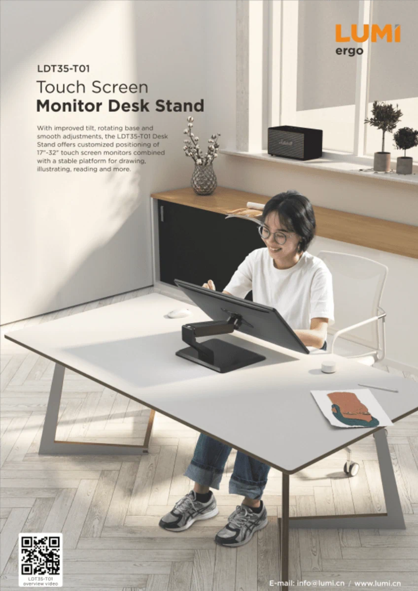 מעמד שולחני למסך מגע Lumi Brateck LDT35-T01 הוא פתרון מקצועי, יציב וארגונומי להתקנת מסכי מחשב או מסכי מגע על שולחן העבודה. המעמד מיועד למסכים בגודל 17 עד 32 אינץ' ובמשקל 2-10 ק"ג, ומאפשר התאמה מושלמת של גובה, זווית וסיבוב המסך לנוחות עבודה מקסימלית.