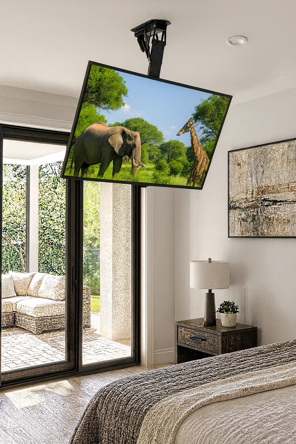 הזרוע מאפשרת הורדה והעלאה חשמלית של המסך בזווית משתנה, ללא כל סיבוב — פתרון אלגנטי ויעיל לתקרה שטוחה או משופעת.