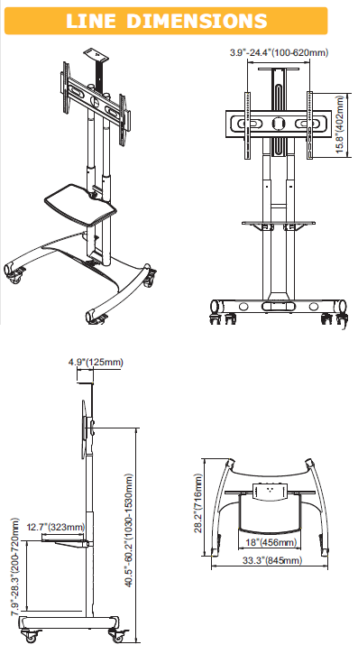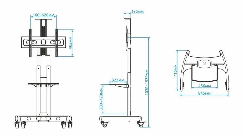 גובה מירבי 153 ס"מ עד אמצע המסך (מתכוונן), אפשרות לנעילת גלגלים בטיחותית