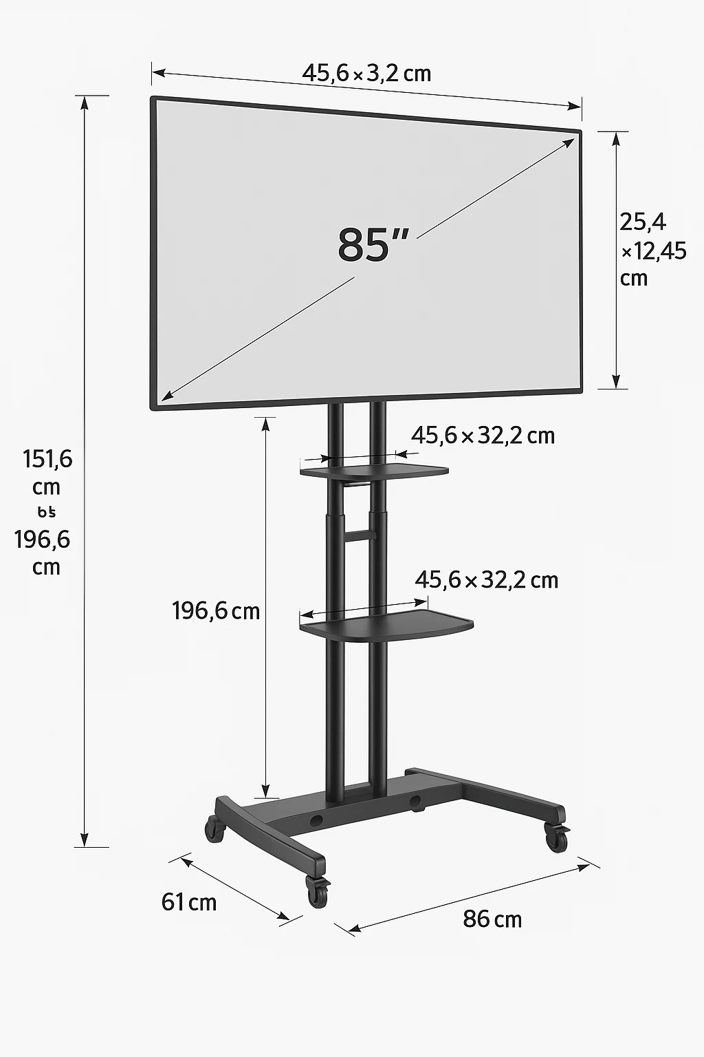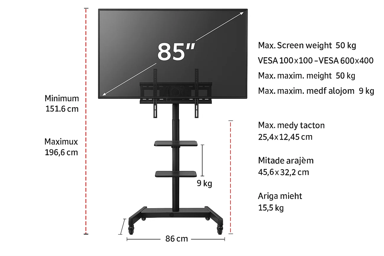 מעמד בטיחותי עם גלגלים לכל מסך עד 75 אינץ'