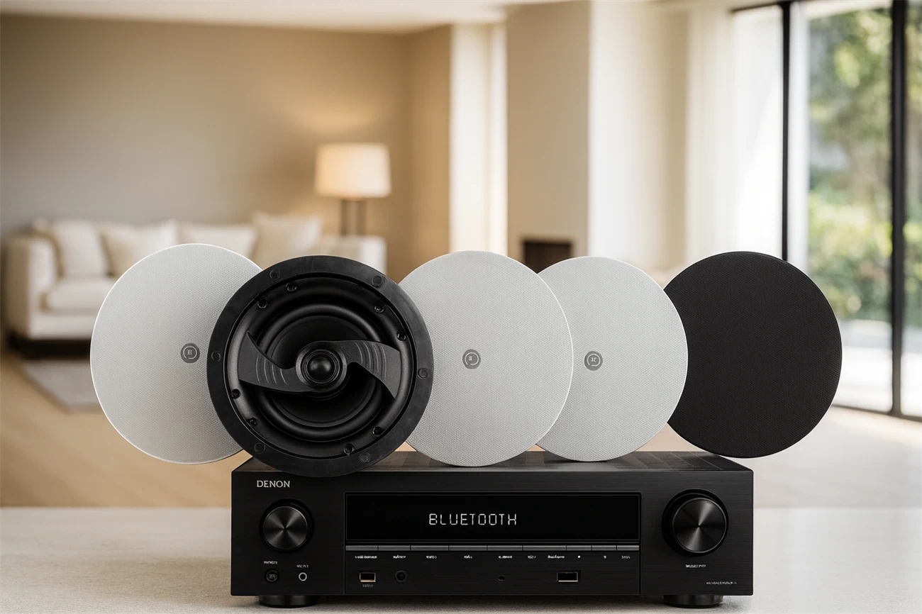 5 רמקולים שקועים לקולנוע ביתי ומוסיקה ורסיבר מעולה של DENON