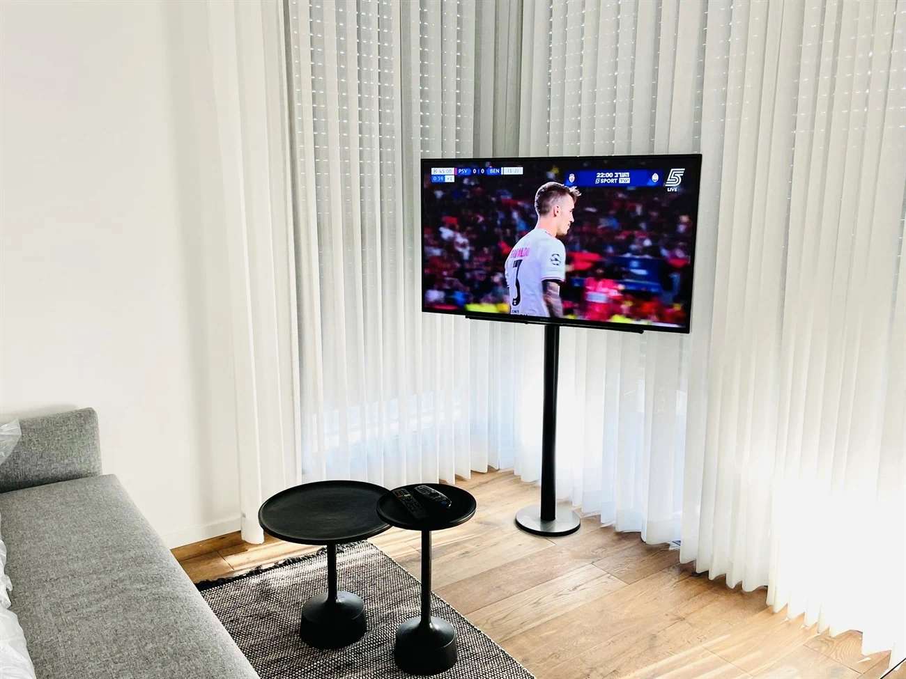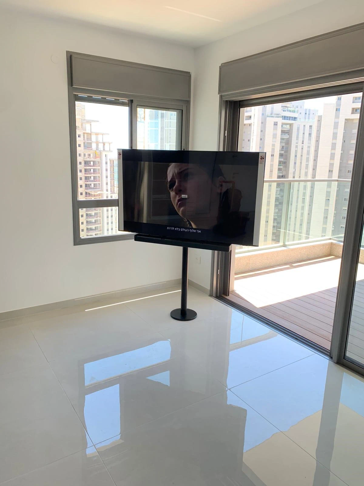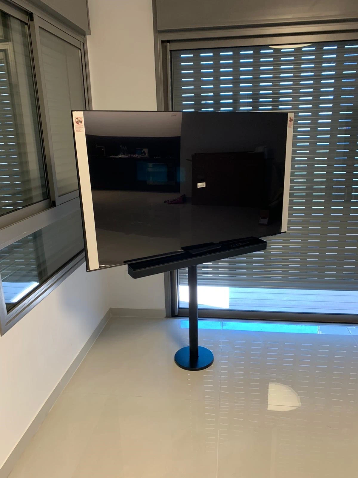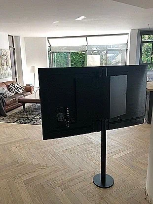 מדובר בפתרון מתקדם שבו הטלוויזיה מותקנת על עמוד מתכת חזק שמעוגן ישירות לרצפה באמצעות קדיחה.