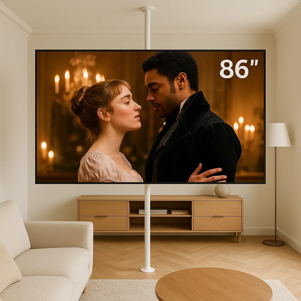 עמוד טלוויזיה לבן מהרצפה לתקרה למסכים עד 86 אינץ' – פתרון אלגנטי ומודרני