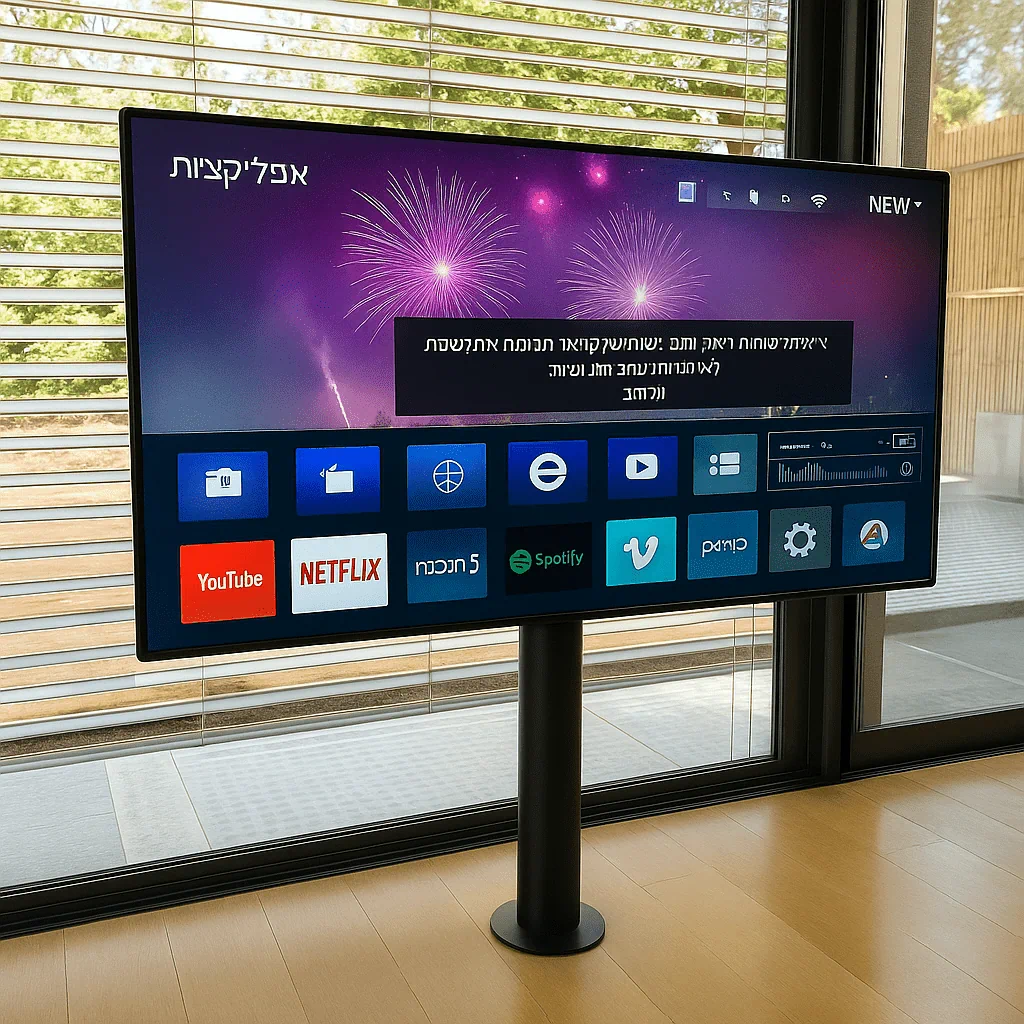 מדובר בפתרון מתקדם שבו הטלוויזיה מותקנת על עמוד מתכת חזק שמעוגן ישירות לרצפה באמצעות קדיחה.