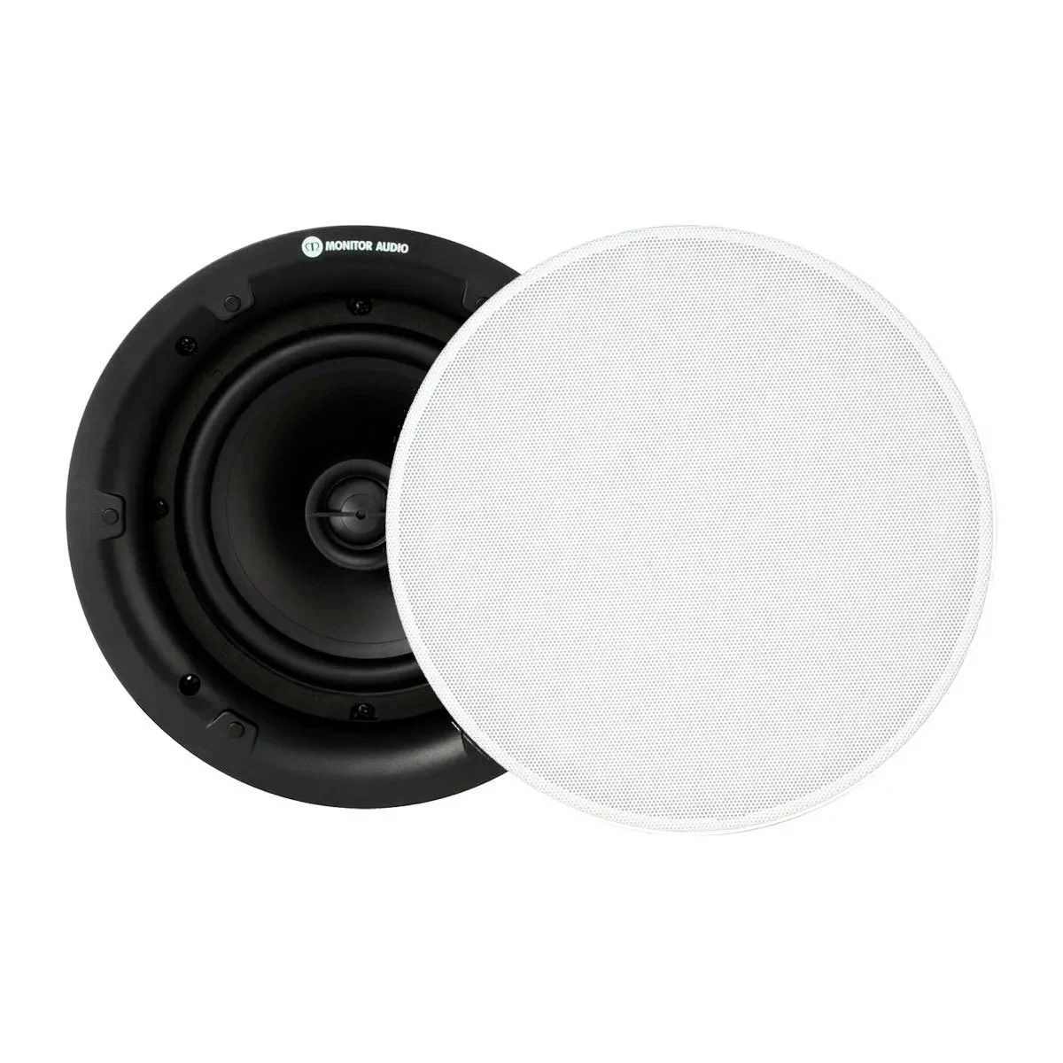 זוג רמקולים שקועים לקיר / תקרה עגולים מבית MONITOR AUDIO איכותיים במיוחד הכוללים מגבר הבנוי על יחידת הרמקול כולל בלוטוס מובנה ובכך מתאפשרת הזרמת מוזיקה איכותית ללא שום מגבר חיצוני. המערכת פועלת כאשר אחד הרמקולים הינו מוגבר והרמקול השני מתחבר אליו באופן חוטי/קווי. היחידה המוגברת מתחברת לחשמל על ידי שנאי מתאים. (מסופק עם המוצר).