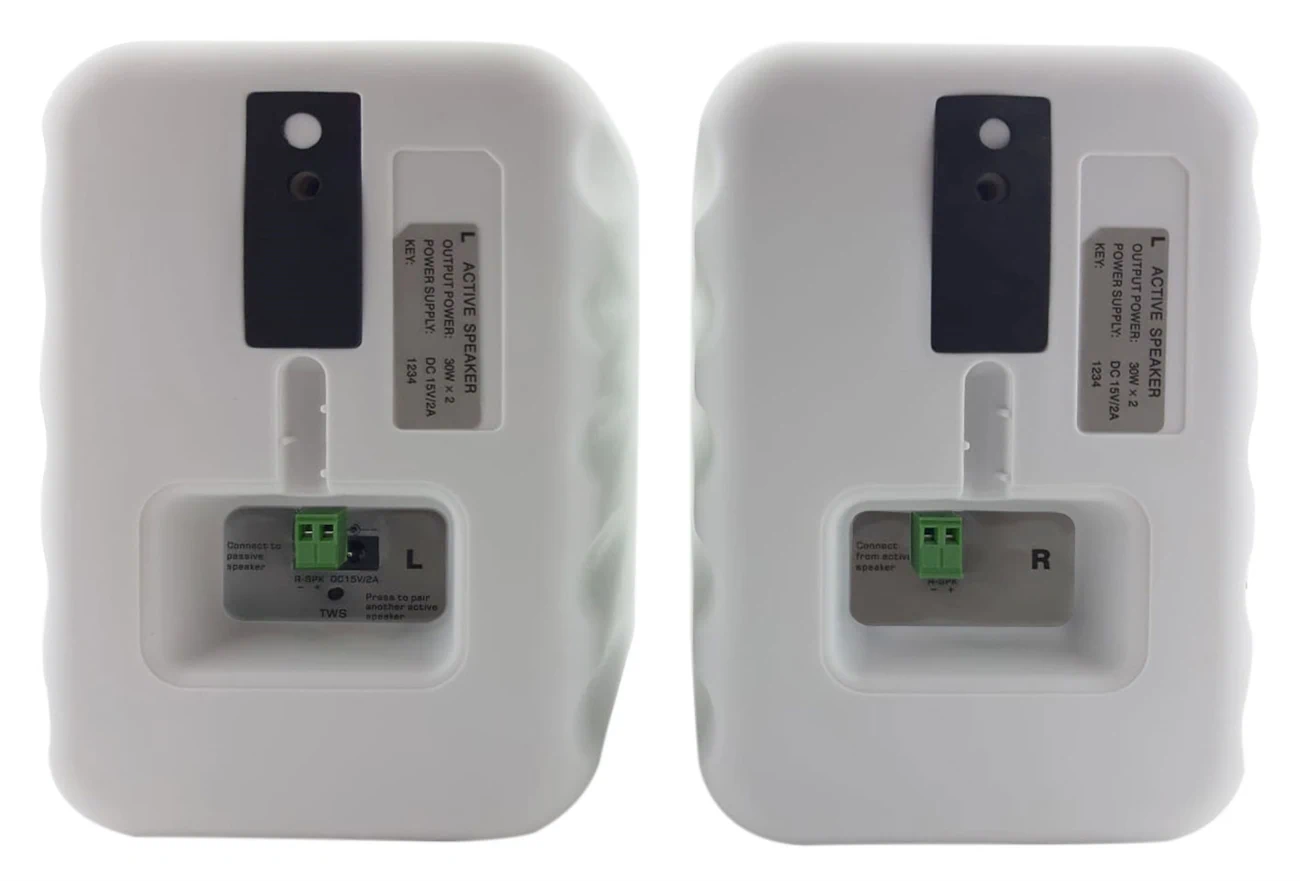 זוג רמקולים ״5 בלוטוס אקטיביים בעיצוב אלגנטי בצבעים שחור ולבן, עם איכות צליל גבוהה וסאב מובנה.