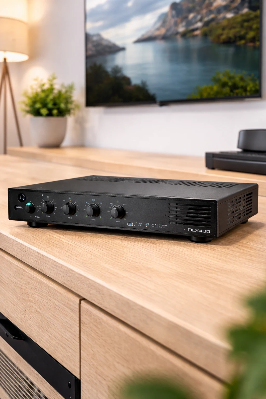 מגבר קומפקטי, חזק ויעיל – מיועד להפעלת עד 4 רמקולים בצורה מאוזנת ומקצועית.