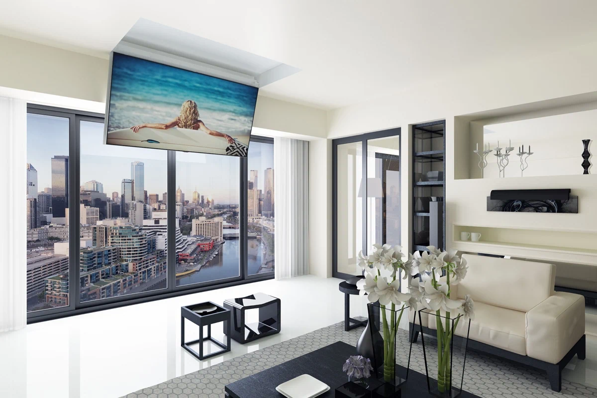 הזרוע החשמלית של SLIMTV מאפשרת להסתיר את הטלוויזיה בתוך התקרה ולהוציא אותה בלחיצת כפתור – פתרון מושלם לחיסכון במקום ולמראה יוקרתי ונקי.